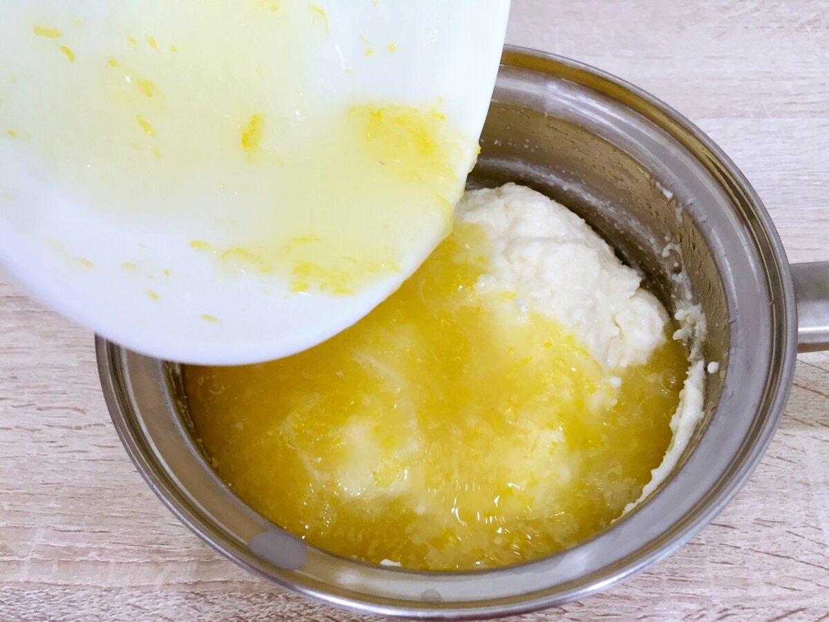 Прибираємо з вогню. Додаємо лимонну суміш і шматочки вершкового масла (після кожного шматочка кашу добре розмішуємо).