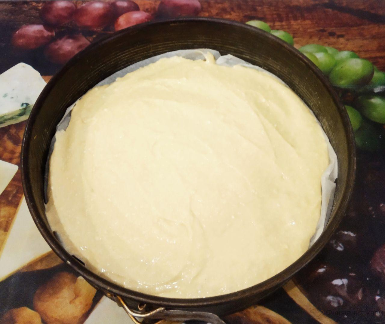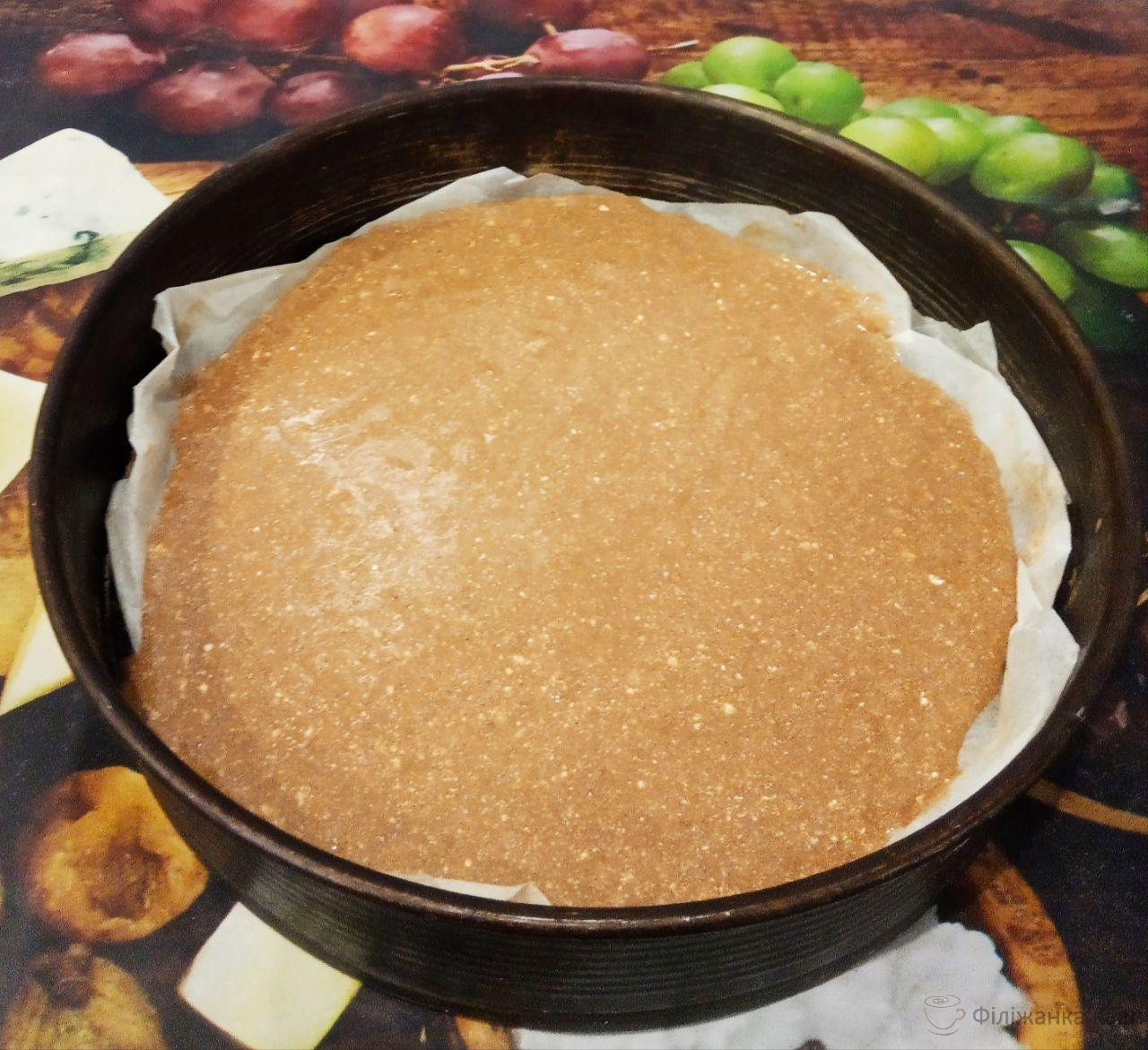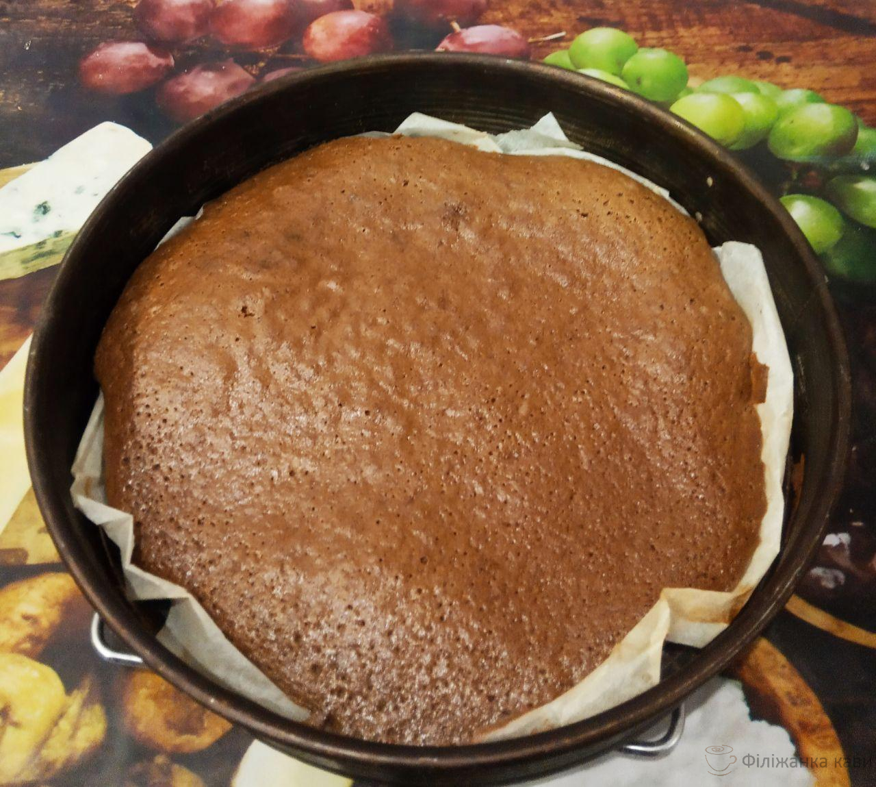 7. Духовку розігріваємо до 180 С. Форму застеляємо пергаментом, викладаємо одну частину тіста і випікаємо близько 30 — 35 хвилин. Ненароком видалила фотографію з спеченим коржем.