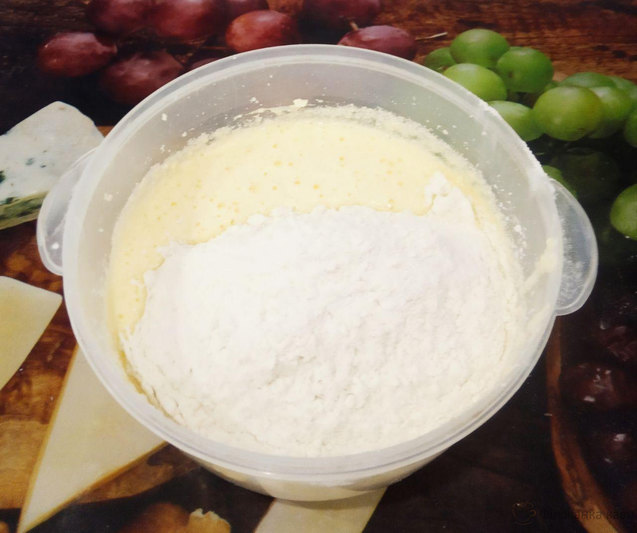 5. Борошно просіюємо через дрібне сито і частинами додаємо в тісто, розмішуємо.