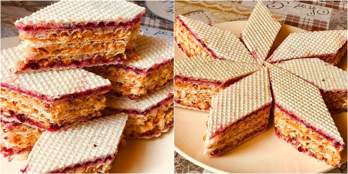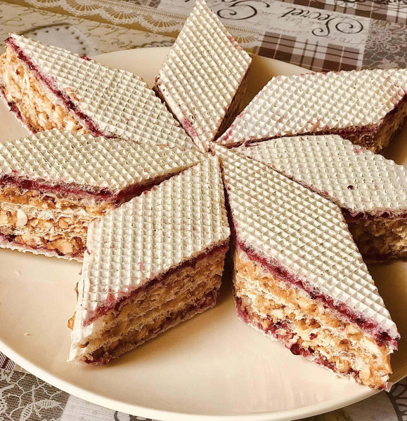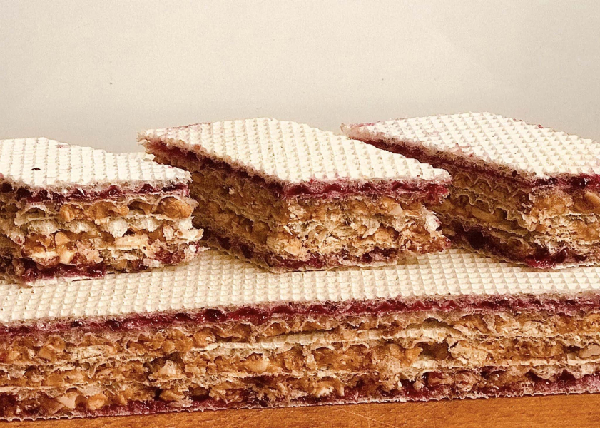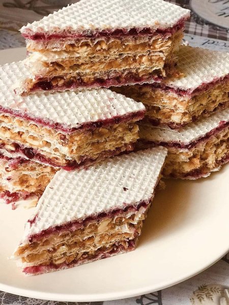 Верхню і нижню вафлі змащую варенням (дуже гарно підходить саме із смородини) інші 3 масою з крекеру горішків і згущонки.