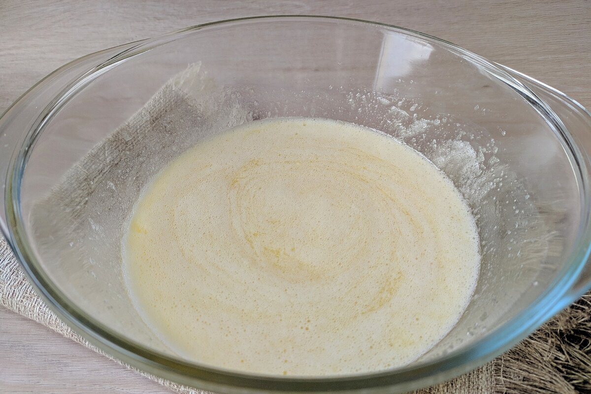 4. В окрему миску кладемо вершкове масло і розтоплюємо на водяній бані або в мікрохвильовій печі до рідкого стану. Даємо трохи охолонути. Вливаємо масло до яєць і перемішуємо.