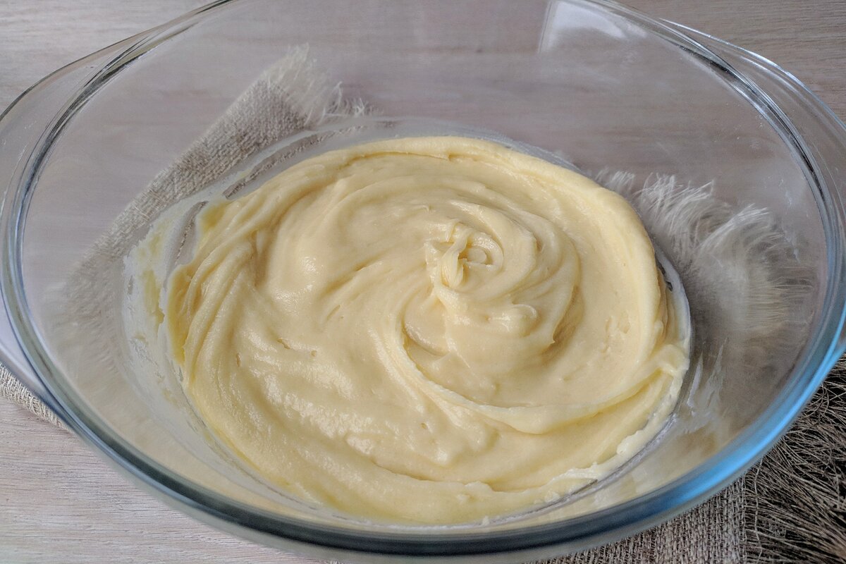 5. Невеликими порціями всипаємо борошно і ретельно розмішуємо до отримання однорідного тіста.