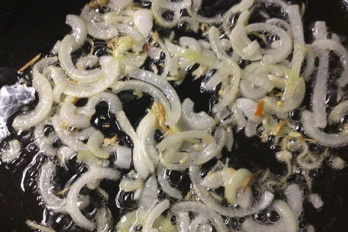 Ріпчасту цибулю нарізаємо півкільцями і обсмажуємо на олії до золотистого кольору з додаванням часнику.