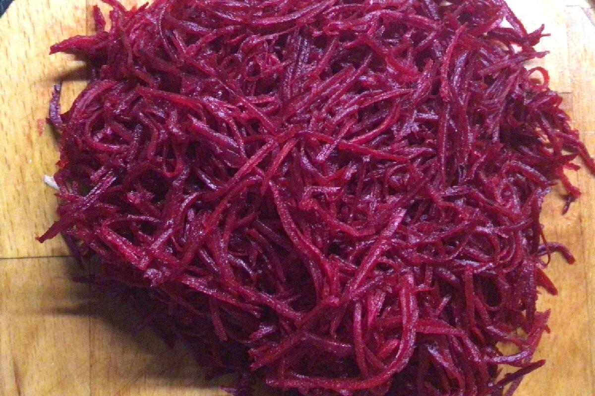 Буряк сирий помити, очистити від шкірки і нашаткувати на терці для корейських салатів на дрібних лезах.