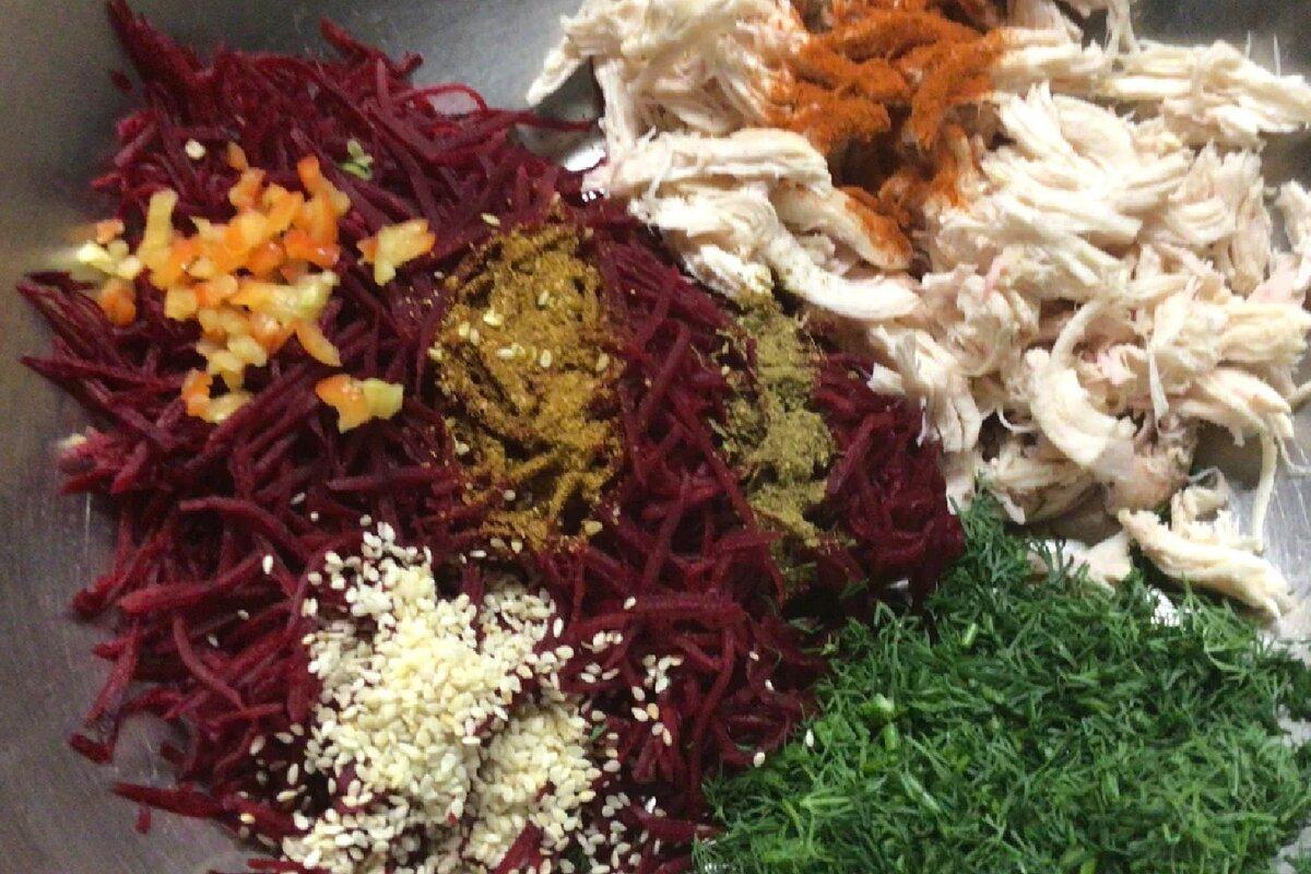 Далі збираємо салат. У миску складаємо буряк, куряче філе, зелень, спеції. Додаємо гарячу олію, оцет, соєвий соус. Все перемішуємо і прибираємо в холодильник на пару годин, щоб буряк і куряче філе просочилися спеціями.