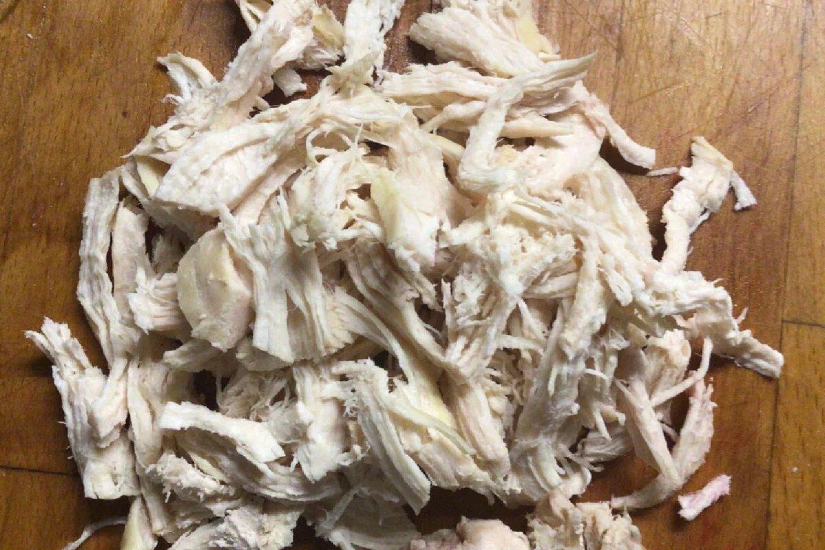 Відварене куряче філе нарізати або довільно нарвати вздовж волокон.