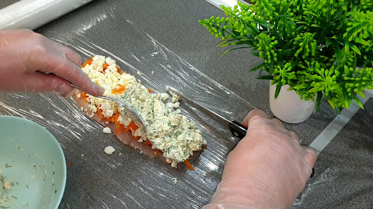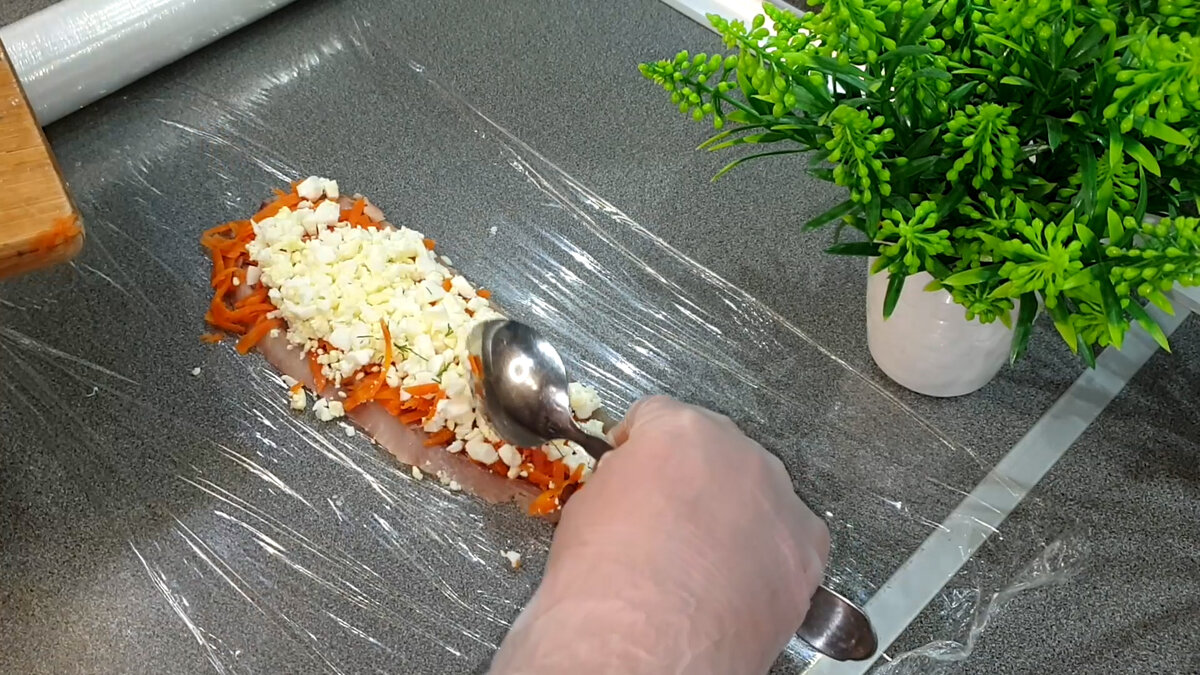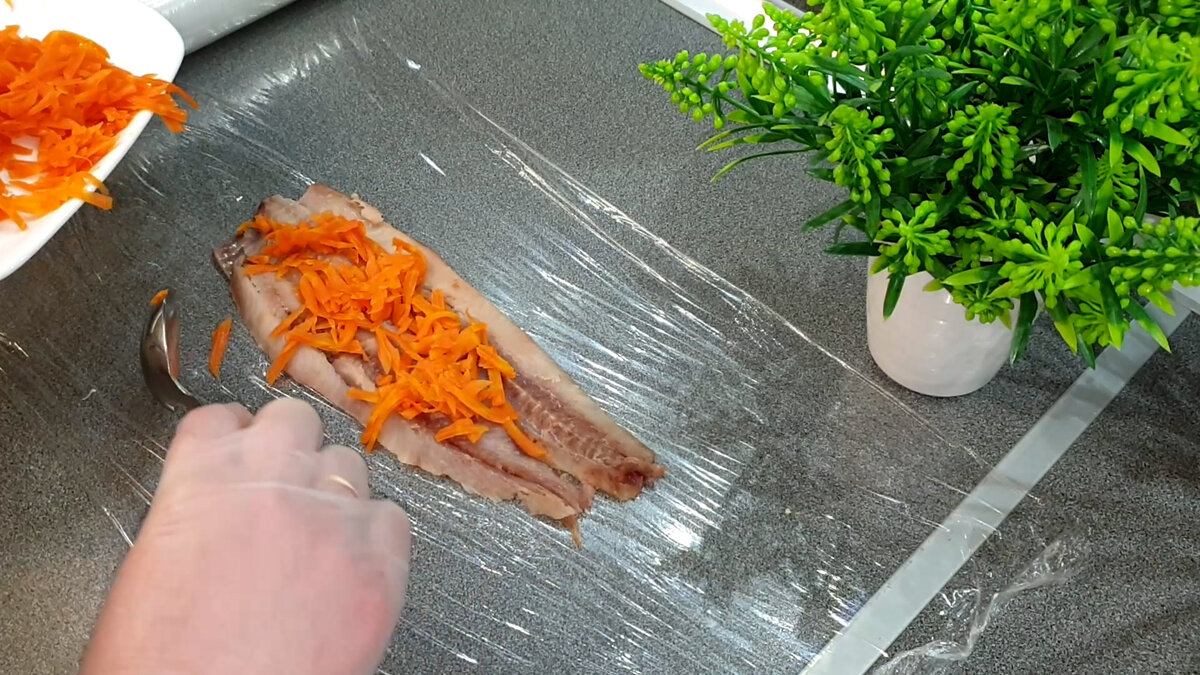 На харчову плівку я викладаю одну частину філе. Зверху шарами буду викладати продукти, першим шаром – моркву.