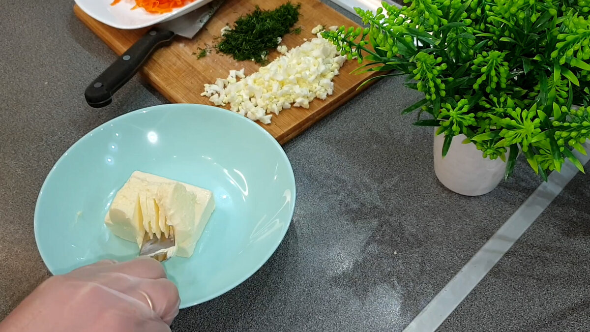 Плавлений сир, 90 грам. Додаю 2 столові ложки вершкового масла.