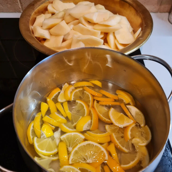 4 лимони нарізати четвертинками (кісточки викинути) залити 300 мл окропу і проварити хвилину.