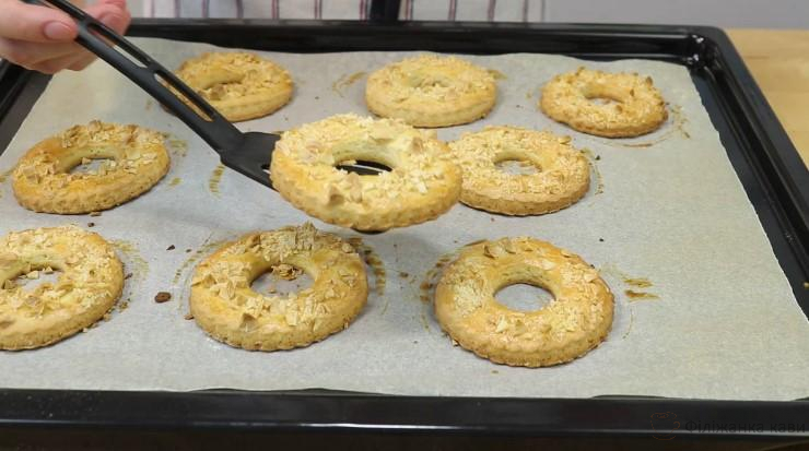 Кільця переношу на лист покритий пергаментом. Щедро змащую збитим яйцем і присипаю мигдалем.