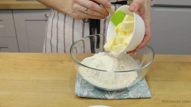 Борошно змішую з маслом. Масло холодне порізала його кубиком.