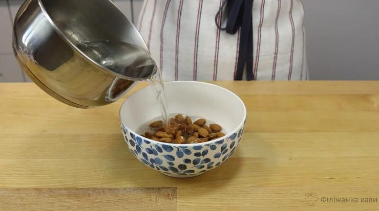За цей час слід підготувати горіхи. Мигдаль заливаю окропом і залишаю на 10 хвилин.
