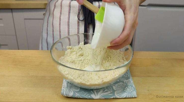Сметану змішую із содою, вливаю в крихту.