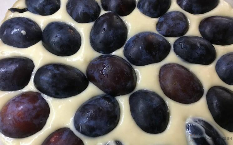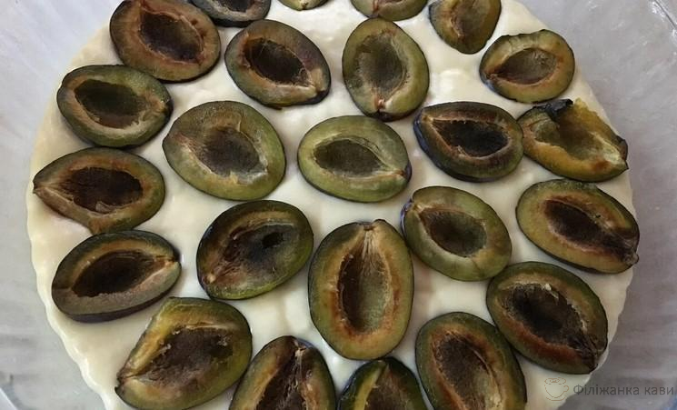 Шар тіста зі сливами заливаю половиною тіста. Зверху викладаю останні сливи зрізом вниз. Сливи можна злегка втиснути в тісто.