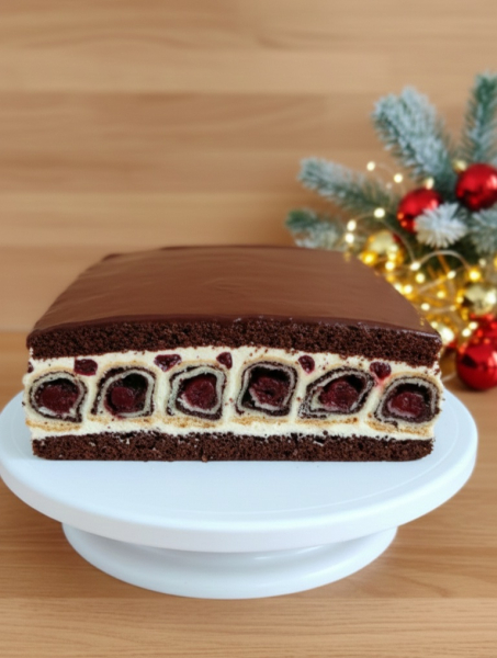 На шоколадний корж викласти частину крему,тоді трубочки,зверху змастити легко кремо і смужками вишневу начинку.