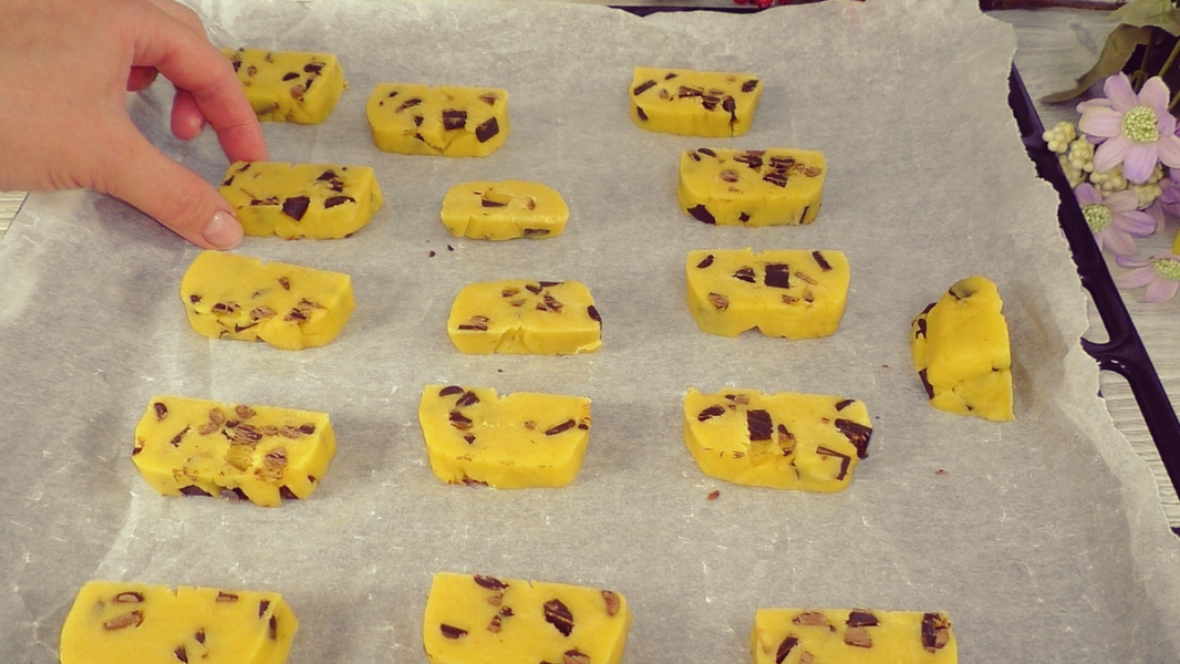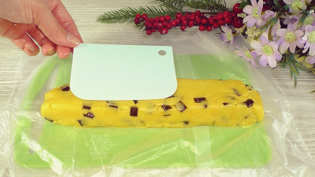 На пакеті або харчовій плівці з тіста розкачати або джгут, або надати йому квадратної форми, за бажанням трикутної, загорнути і прибрати в морозильну камеру на 30 хвилин. За цей час вершкове масло затвердіє, і Ви з легкістю наріжете заготовки для печива.