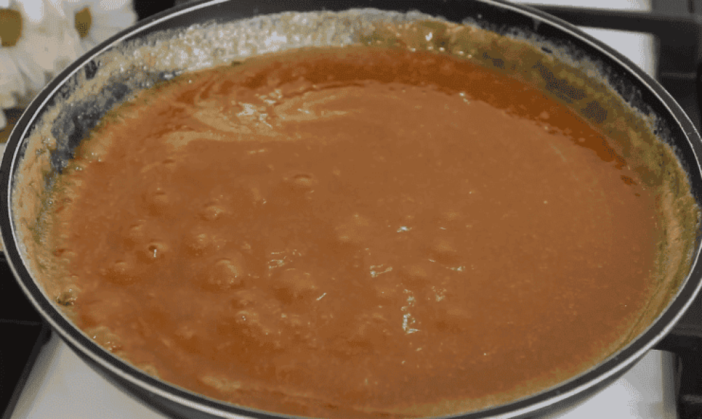 Як тільки сироп набуває прекрасного бурштинового відтінку, вимкніть вогонь. Налийте гарячі вершки і активно мішайте. Будьте обережні, маса починає дуже пінитися.