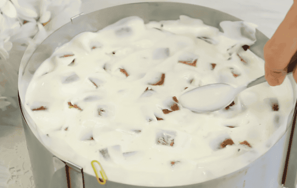 Знизу торт змащуємо кремом і ставимо його на тарілку. Зверху крем, а потім чергуйте 4 рази: шар кубів і шар крему.