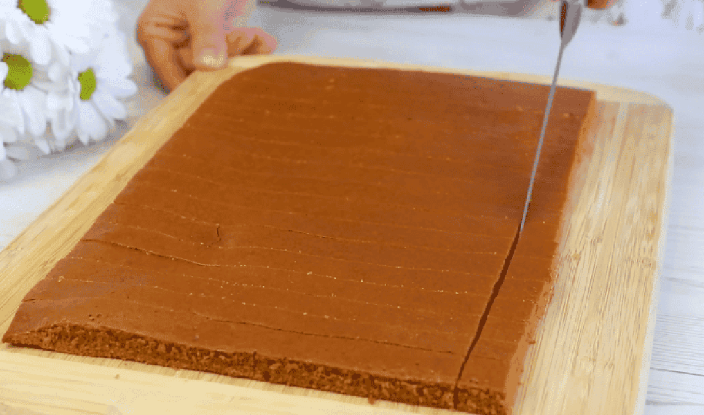 Вирізаємо гарячий корж на квадрати. Розділити на 4 частини.