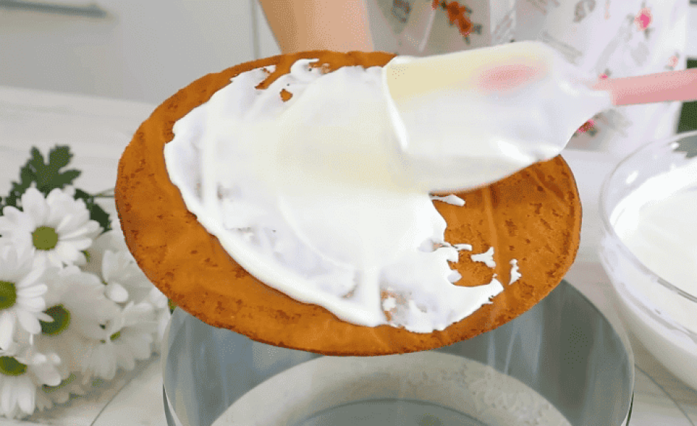Крем. Збийте сметану, цукор і ванілін. Відкладаємо 150 г крему на бічну поверхню торта для прикраси.