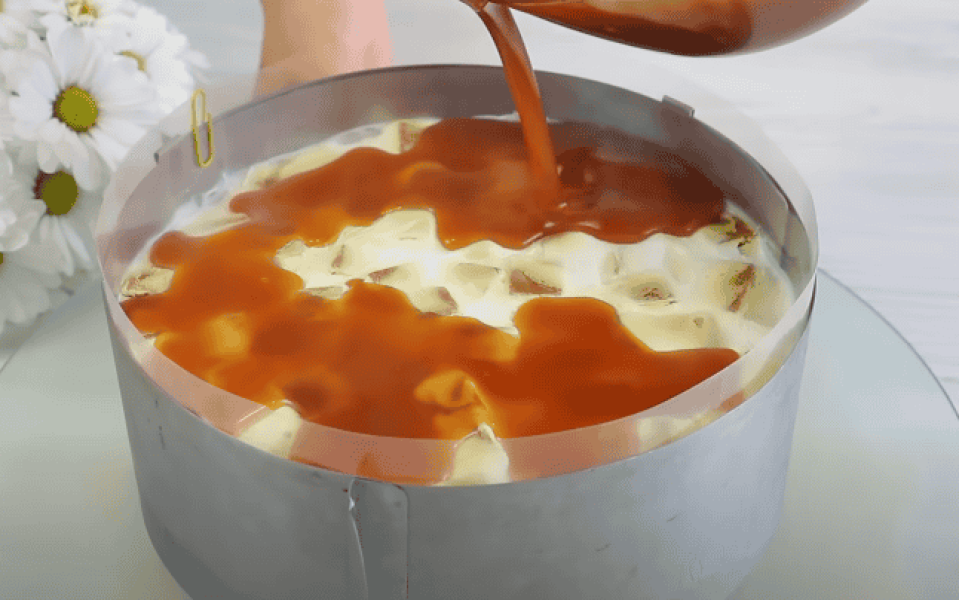 Налийте в карамель, мішаючи до однорідної консистенції. Смачний кремовий карамельний мус готовий. Налийте відразу на торт.