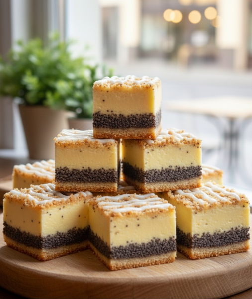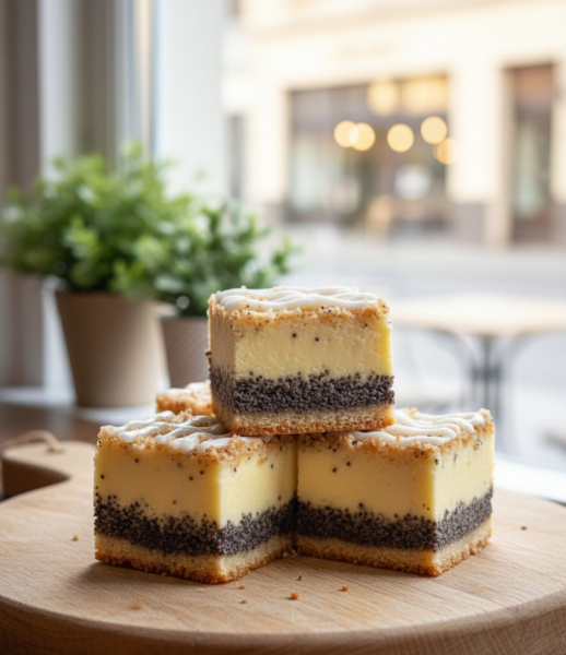 Усі інгредієнти коротко збийте міксером — лише до об’єднання компонентів. Вилийте на маковий шар і розрівняйте.