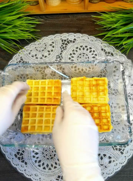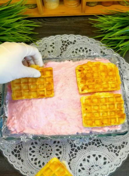 🔻 Форму приблизно 15×25 застилаємо харчовою плівкою, викладаємо вафлі, печиво або бісквіт,