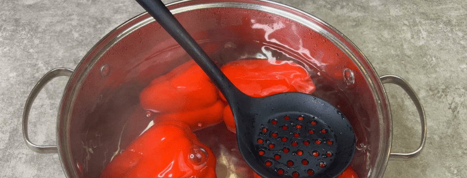 ✅ Відправляємо перці в киплячу воду, бланшируємо рівно 5 хвилин, потім витягаємо і тимчасово забираємо убік.