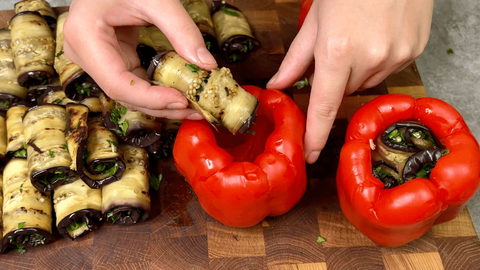 Перці набиваємо максимально щільно. В один перець легко увійде 3-4 рулетики.