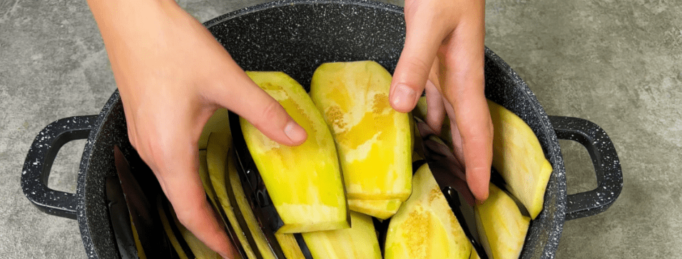✅ Баклажани нарізаємо на пластини, перекладаємо у відповідну ємність, вливаємо олію і добре перемішуємо, щоб олія розподілилася по всіх баклажанах.