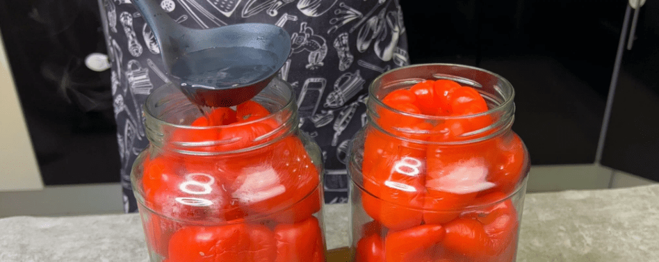 ✅ У каструлю з водою всипаємо цукор, сіль, доводимо до кипіння, потім вливаємо 9% оцет, перемішуємо та знімаємо з вогню. Гарячий маринад відразу розливаємо по банках з перцями.