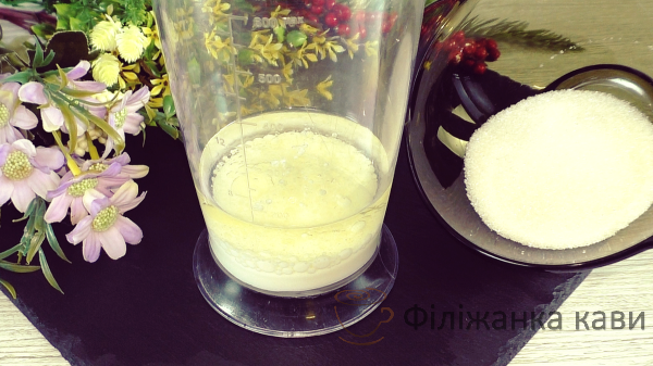 Тепер додати цукор, цукор бажано брати дрібного помелу. Краще, якщо є, використовуйте цукрову пудру.