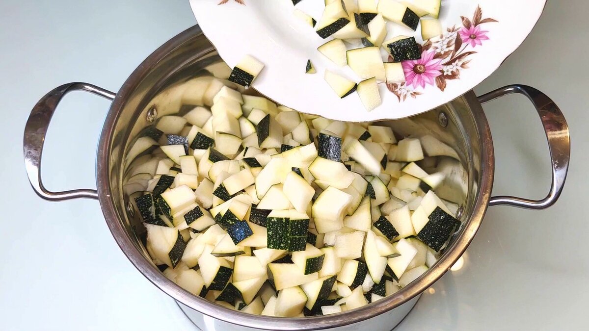 1. Нарізаю кабачки або цукіні невеликими кубиками і кладу їх в глибоку каструлю.