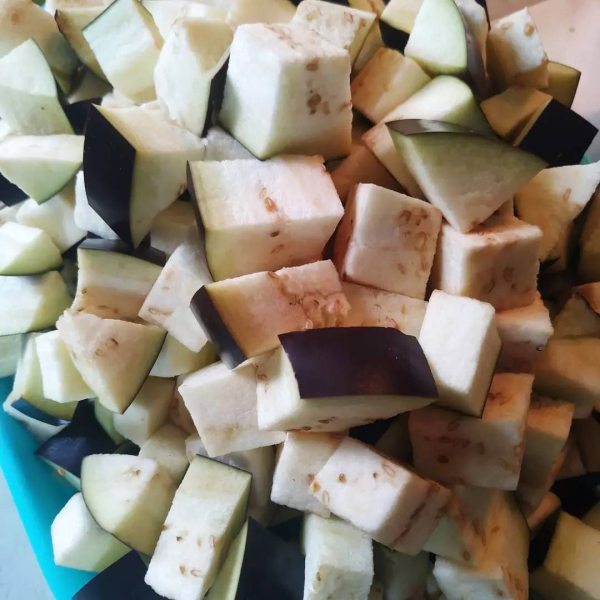 - Баклажани – 1 кг. і перець солодкий – 0,5 кг. почистити та нарізати кубиками.