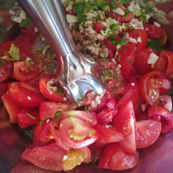 - Помідори 750 гр, гіркий перець – 1 шт, часник півтори головки очистити і пропустити через м’ясорубку або подрібнити блендером.