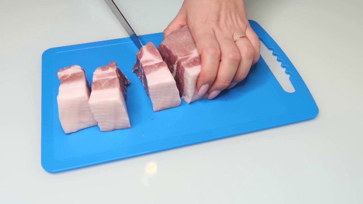 1. Свинячу грудинку нарізаю на шматочки товщиною близько 2,5 см ( я купую грудинку без кісток ).
