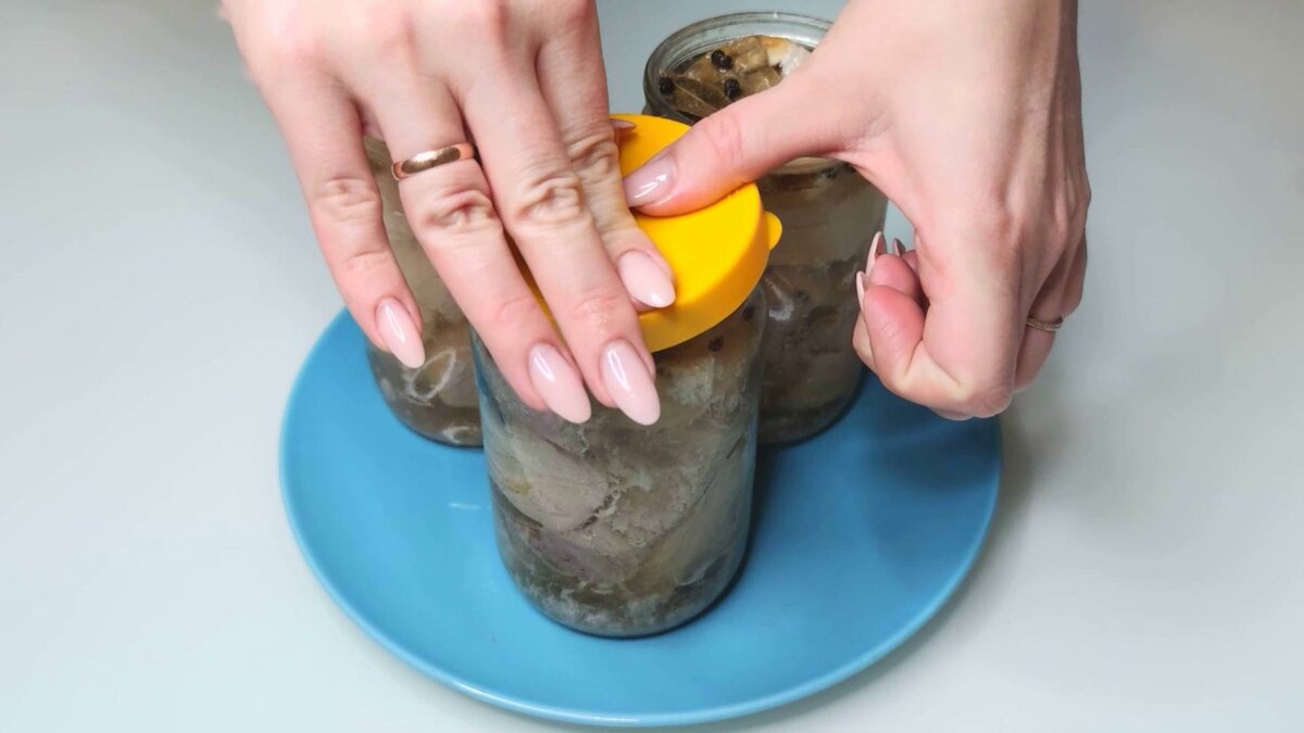 7. Через 2,5 години дістаю банки і даю їм повністю охолонути. Потім закриваю пластиковими кришками ( тушонка у нас довго не зберігається, тому банки я не закручую і зберігаю тушонку просто в холодильнику).