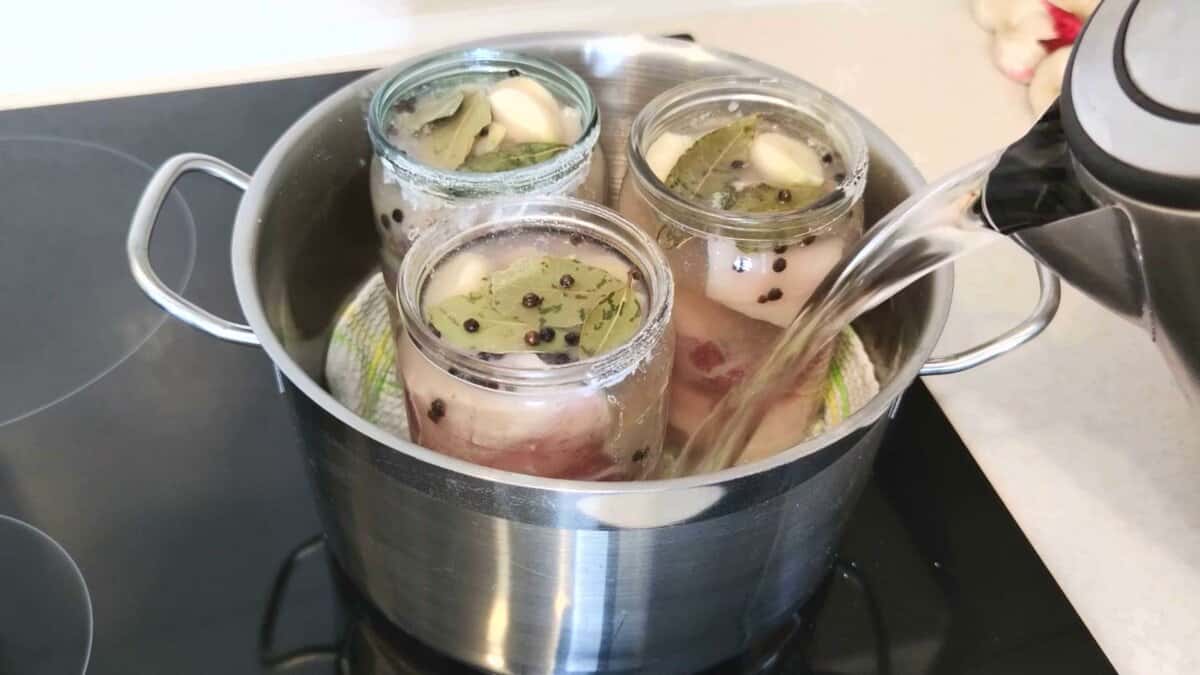 6. Вистилаю дно каструлі рушником. Ставлю банки з грудинкою і заливаю їх теплою водою практично до самого верху. Доводжу воду до кипіння, накриваю каструлю кришкою і томлю банки 2,5 години на малому вогні, періодично підливаючи воду в каструлю.