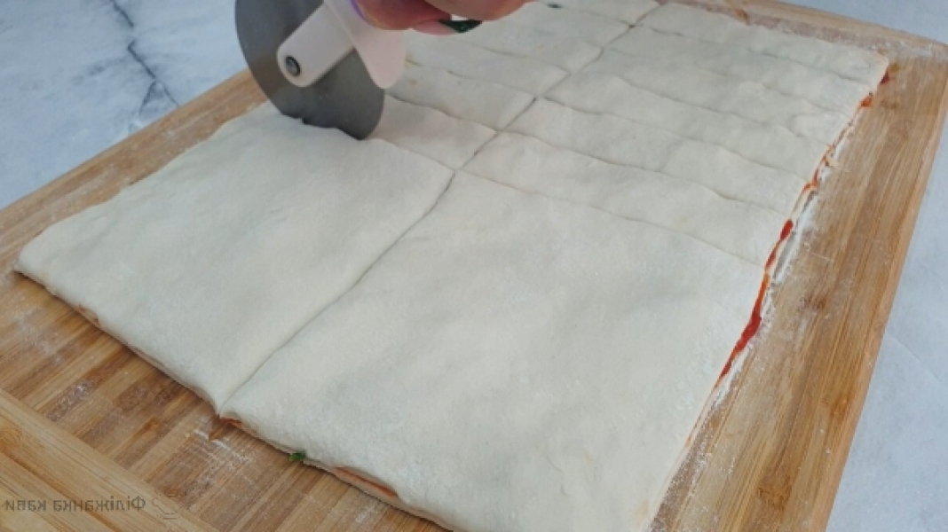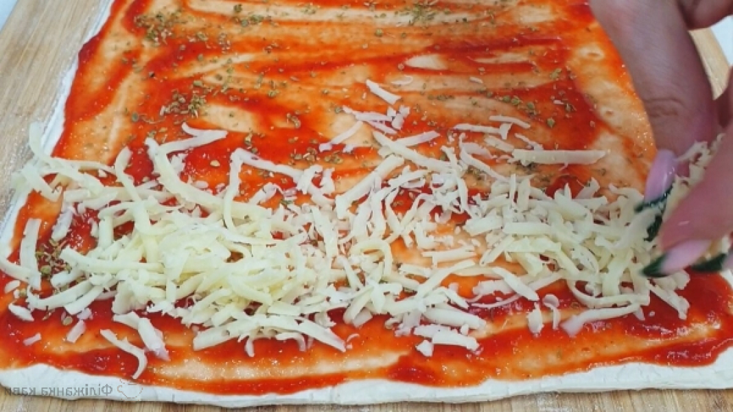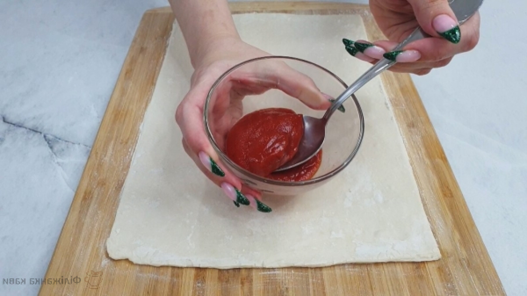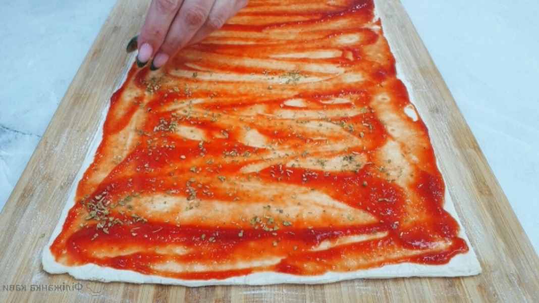 Розкочує тісто в прямокутник. Змащуємо тісто томатним соусом.