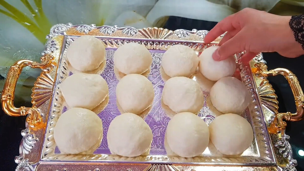 Тісто ділимо на 10-12 рівних частин. Залишимо на 10-15 хвилин під плівкою