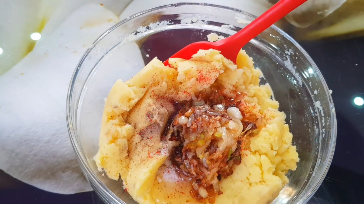 Картопляне пюре змішаємо зі смаженою цибулею, додамо вершкове масло, сіль і перець за смаком.