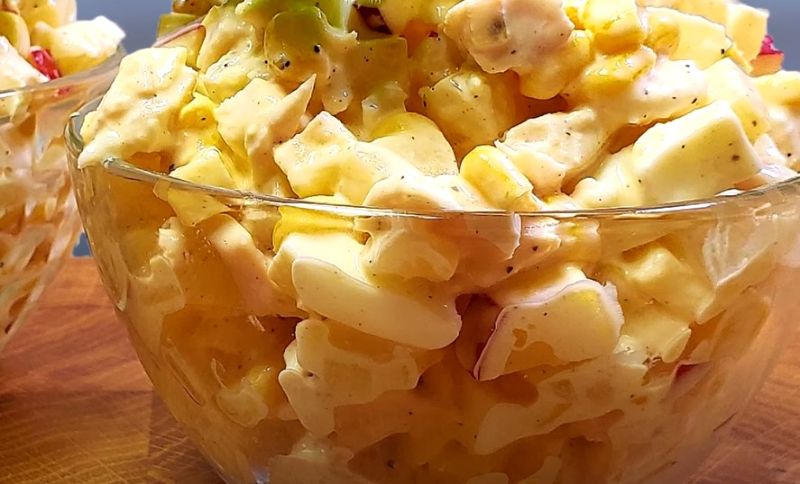 - Відварені яйця нарізаємо шматочками. Кукурудзу зливаємо.