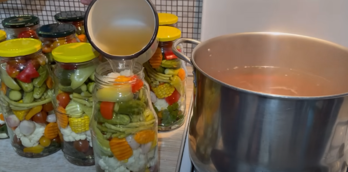 3) Злити з банок усю воду і приготувати розсіл, киплячим розсолом залити овочі,