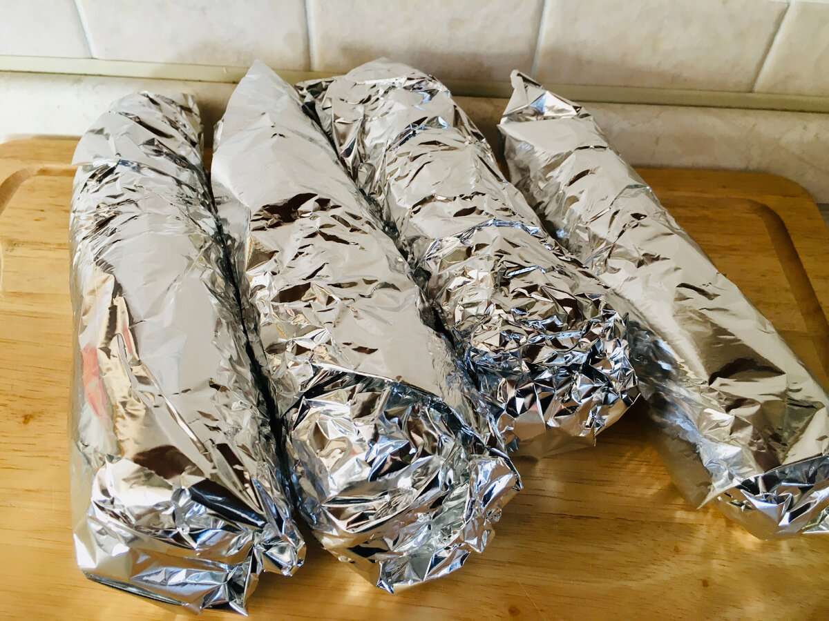 Загортаю кожен качан в фольгу, як рулет або цукерку. Викладаю заготовлені “ковбаски” на вистелене фольгою деко і розміщую його в попередньо розігріту до 180 градусів духовку.