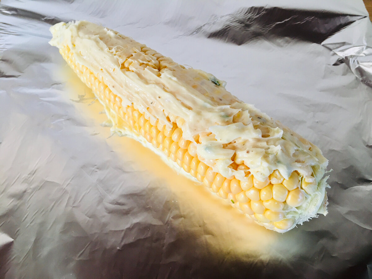Для кожного качана готую свій лист фольги, який і буде оболонкою, в якій качан буде запікатися. На фольгу намазую масло тонким шаром. Викладаю качан і змащую його теж ароматним маслом.