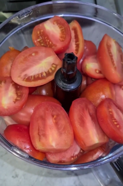 Томати ріжемо на четвертинки, або половинки, якщо малі і пробиваємо на блендері або на м’ясорубці. Від шкірки звільняти не потрібно!