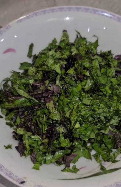 Тим часом пропускаємо часник через прес, а базилік дрібно нарізаємо.