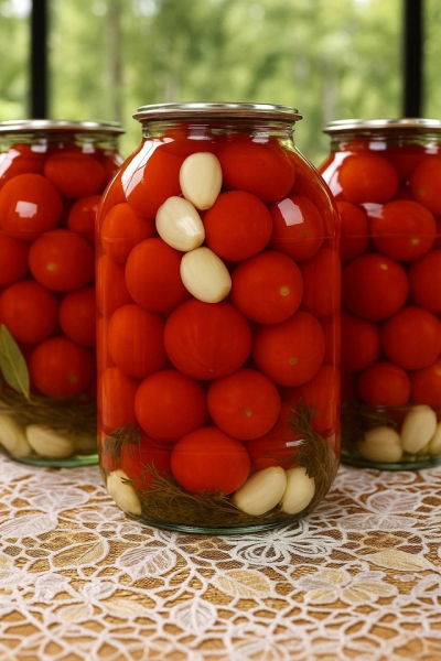 На 1 півторалітрову банку кілька зубців часнику, 1 лавр. листочок, 5-6 горошин чорн.перчика, і кріп, і і викладаємо наші вимиті помідори.