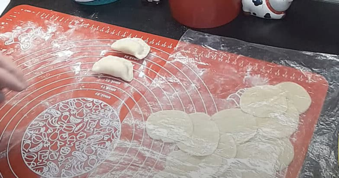 Тісто розкачую у пласт, нарізаю кружечки та викладаю начинку, формую вареники, щільно защіпаючи тісто.