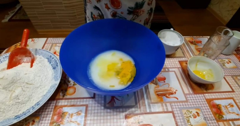 У велику миску влийте холодну воду, молоко і олію, вбийте яйця і посоліть (0,5-1 ч. л.), щоб тісто було солоним.